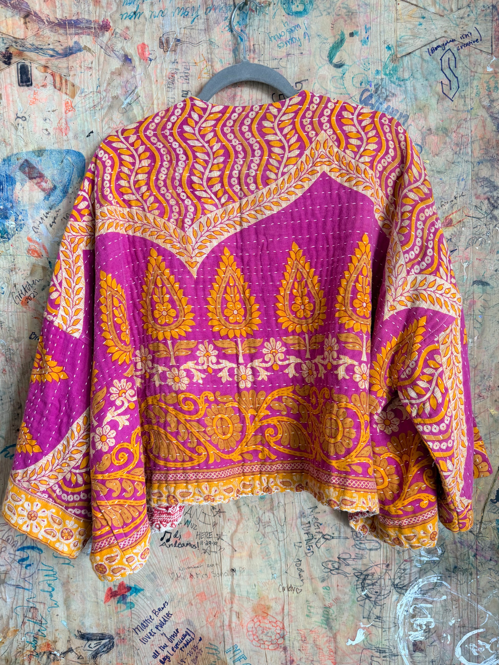 The Magenta & Orange Kantha Quilt jacket is crafted from a vintage 100% cotton Kantha quilt and is fully reversible. It is sized to fit a US M/L and designed to fall at or just below the waist.