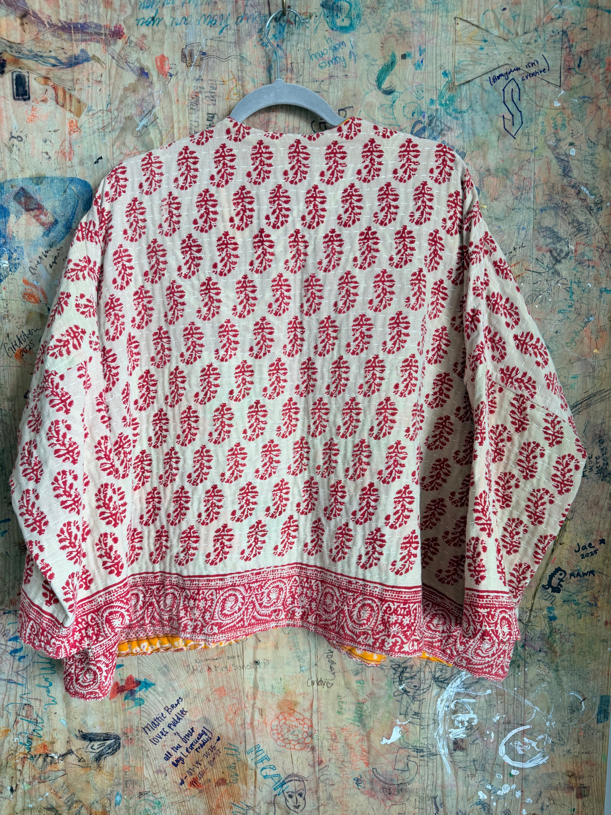 The Paisley Kantha Quilt jacket is crafted from a vintage 100% Kantha quilt and offers a fully reversible design. It is sized to fit a US M/L and is designed to fall at or just below the waist.